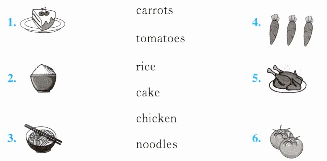 1. cake 2. rice 3. noodles 4. carrots 5. chicken 6. tomatoes