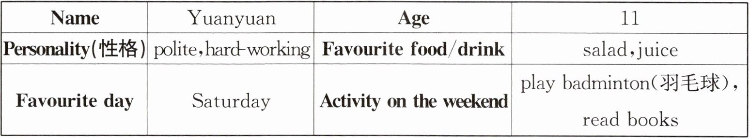 班上来了新同学 Yuanyuan,为了让同学们更好地了解她,Yuanyuan 准备介绍自己。请你根据表格提示,帮助 Yuanyuan 完成自我介绍吧!