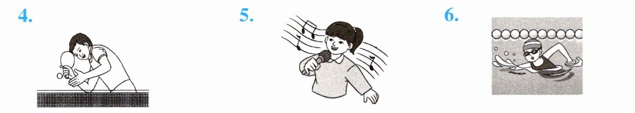 )A. sing B. swim C. read a book D. play basketball E. dance F. play ping - pong
