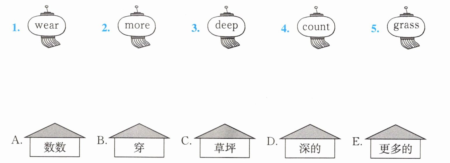 A. 数数 B. 穿 C. 草坪 D. 深的 E. 更多的