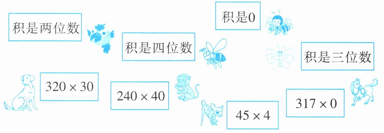 所以积是两位数没有;积是四位数:$320×30$,$240×40$;积是$0$:$317×0$;积是三位数:$45×4$。