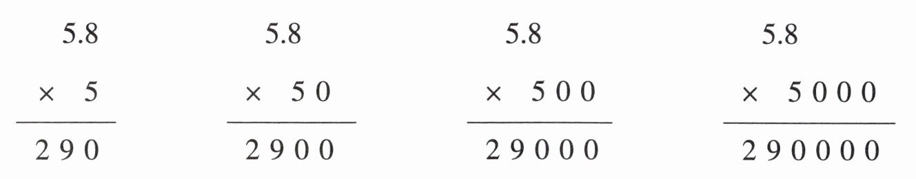 $5.8×5000$,先计算$58×5000 = 290000$,因数中一共有一位小数,所以从右向左点上小数点,即$29000.0$,小数末尾的$0$可以去掉,结果为$29000$。