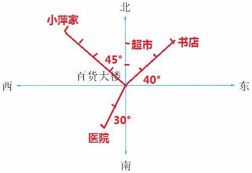 (3)书店在百货大楼的东偏北40度方向150米处。