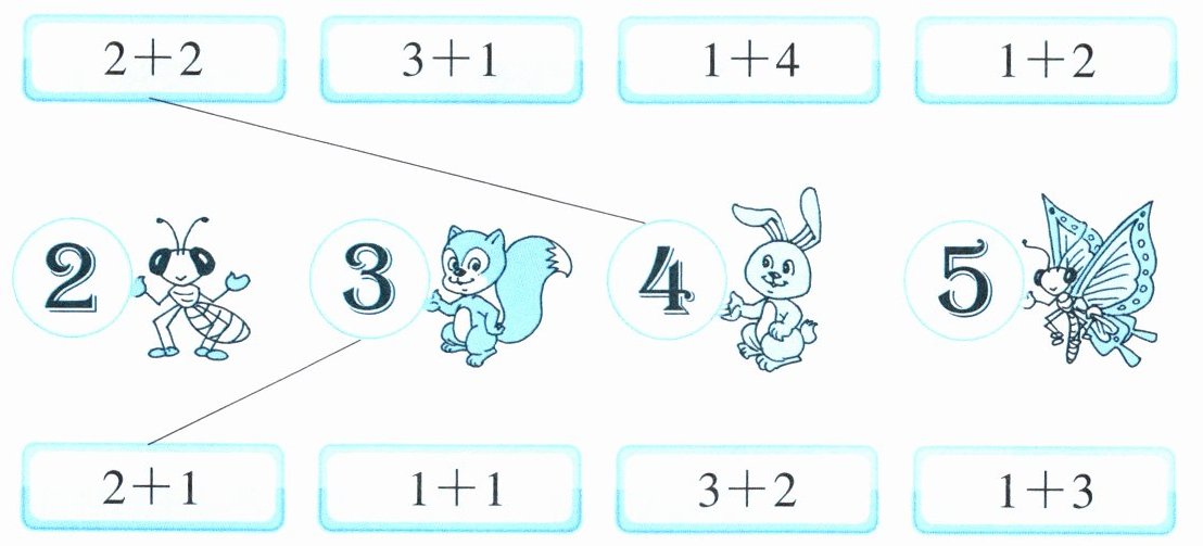 答案:$2 + 2$、$3 + 1$、$1 + 3$与蝴蝶相连;$1 + 4$、$3 + 2$与兔子相连;$1 + 2$、$2 + 1$与松鼠相连;$1 + 1$与蚂蚁相连。