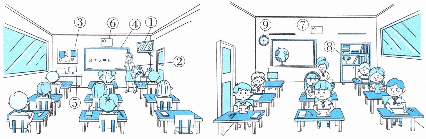 教室前面有(①②③④⑤⑥),教室后面有(⑦⑧⑨)。