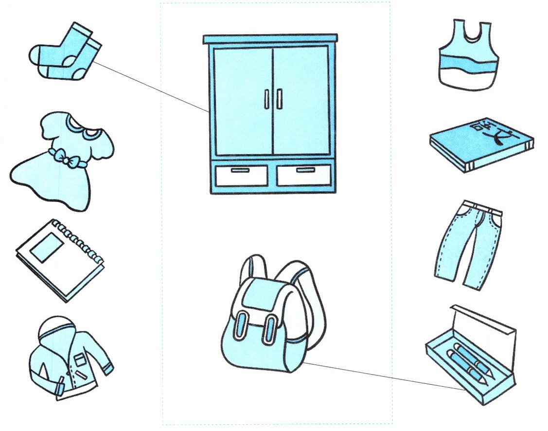 将连衣裙、背心、牛仔裤、外套与衣柜相连;将语文书、笔记本与书包相连