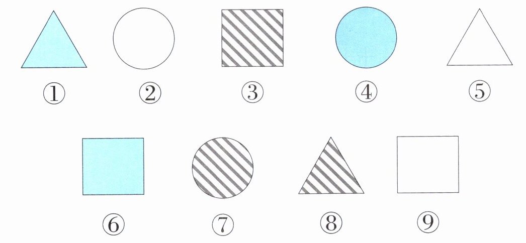 按照形状分:三角形有①⑤⑧,圆形有②④⑦,正方形有③⑥⑨;