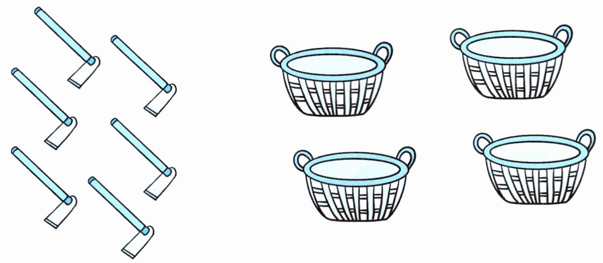 解析:本题考查了10以内数的减法运算。通过观察图片可知,左边有6把锄头,右边有3个篮子。问题是求再拿几个篮子就和锄头一样多,也就是求6比3多几,用减法计算。