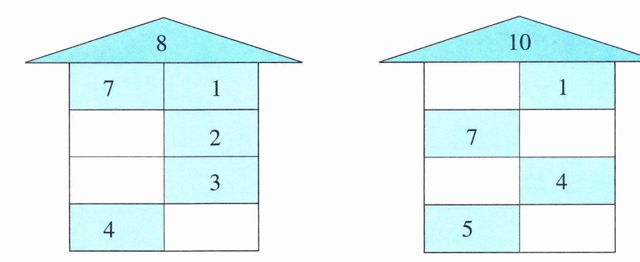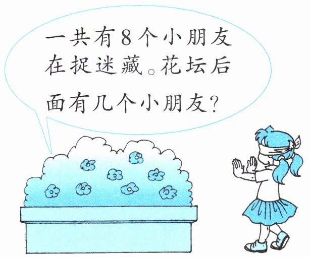第二个图考查10以内数的减法。已知总人数和花坛前面的人数,求花坛后面的人数,用减法计算。