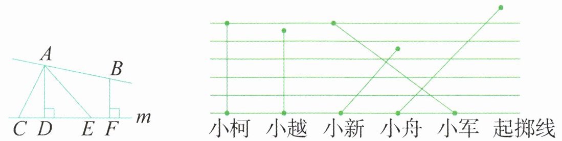 (2)实心球项目以球的落点到起掷线的距离作为运动员的成绩,如右上图所示为五名同学投掷实心球的示意图,这几名同学中,成绩一样的是( )和( )。