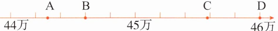 (2)一个数“四舍五入”求近似数后得到 45 万,这个数在下面数线上的位置可能是( )。