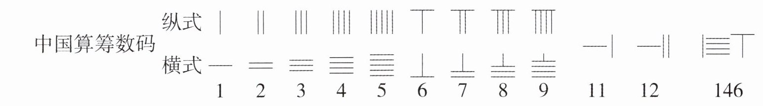 5 [符号表达]算筹记数。我国古代,人们曾用算筹记数,有纵式和横式两种摆法(如图),个位用纵式,十位用横式,百位用纵式,千位用横式,以此类推。遇零则空位。例如“一 Ⅲ ⊥ Ⅲ”表示1979。