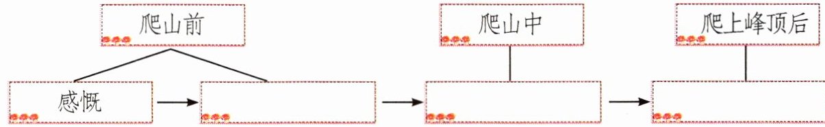 登山前,“我”看到的是,听到的是,想到的是;登山中,“我”看到山道仅能同时容纳两个人并肩通过,听到;登上山顶,“我”看到。