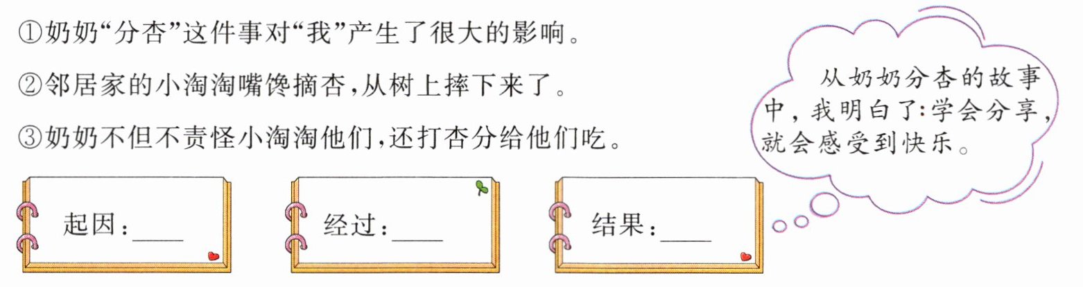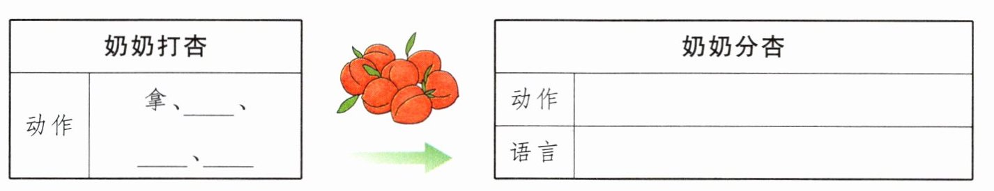 3. 关注第7、8自然段,想一想作者是怎样把奶奶“打杏”“分杏”这两件事写清楚的。(摘取关键词句把表格填写完整)