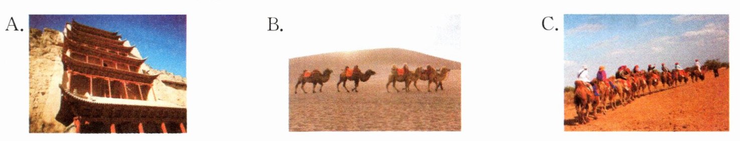 1.出现 消失 B 2.C 3.示例:汹涌的波涛撞击在嶙峋的礁石上,溅起万朵银花 4.B 5.示例:茫茫的戈壁瀚海 敦煌至阳关、玉门关公路的两侧 一队骆驼群 小树林 恍若仙境 变幻莫测