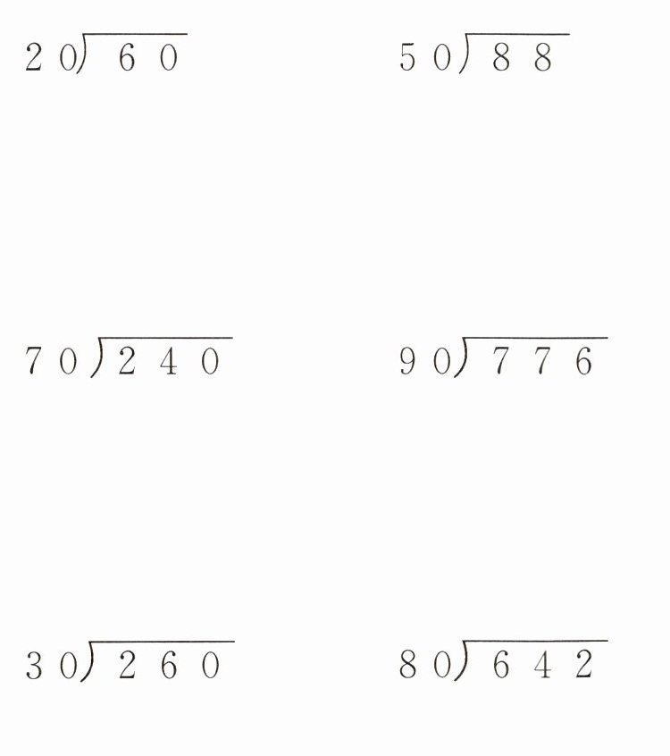 $\begin{array}{r}3\\20\overline{)60}\\60\\ \hline0\end{array}$ $\begin{array}{r}1\\50\overline{)88}\\50\\ \hline38\end{array}$ $\begin{array}{r}3\\70\overline{)240}\\210\\ \hline30\end{array}$ $\begin{array}{r}8\\90\overline{)776}\\720\\ \hline56\end{array}$ $\begin{array}{r}8\\30\overline{)260}\\240\\ \hline20\end{array}$ $\begin{array}{r}8\\80\overline{)642}\\640\\ \hline2\end{array}$