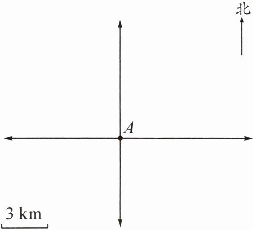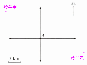 四、非洲草原上,$A$ 点处有两只羚羊在悠闲地吃草,突然它们发现了一头狮子,羚羊甲以每分钟 $1.2$ km 的速度向西偏北 $40^{\circ}$ 方向奔跑,羚羊乙以每分钟 $0.9$ km 的速度向东偏南 $30^{\circ}$ 方向奔跑。请在图中标出 $10$ 分钟后两只羚羊的位置。
