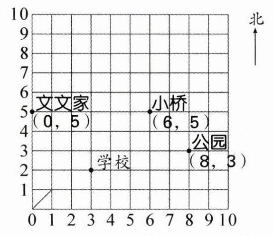),它的东偏北 $45^{\circ}$ 方向 $600$ m 处是小桥,请在图中标出小桥的位置,并用数对表示出来。2. 公园位于小桥的南偏东 $45^{\circ}$ 方向 $400$ m 处,请在图中标出公园的位置,并用数对表示出来。