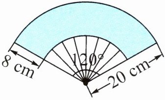六、[3.14×20² - 3.14×(20 - 8)²]×$\frac{120}{360}$≈268(cm²)
