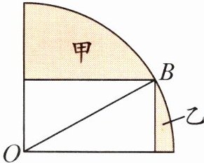 七、如图,扇形中的空白部分是一个长方形,扇形的半径为 $6$ cm,线段 $OB$ 把整个扇形分成了面积比是 $2:1$ 的两部分。图中甲的面积比乙的面积大多少?