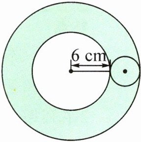 五、如图,小圆的半径是 $2$ cm,现让小圆沿着大圆内圈滚动一周,小圆的圆心走过的路程是多少厘米?小圆滚过的面积(涂色部分)是多少平方厘米?