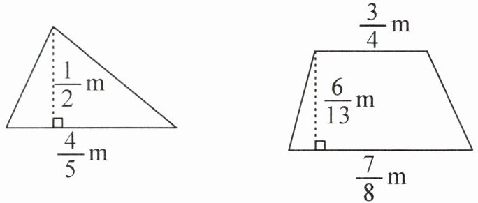 三、$\frac{4}{5} × \frac{1}{2} × \frac{1}{2} = \frac{1}{5}(m^2) (\frac{3}{4} + \frac{7}{8}) × \frac{6}{13} × \frac{1}{2} = \frac{3}{8}(m^2)$