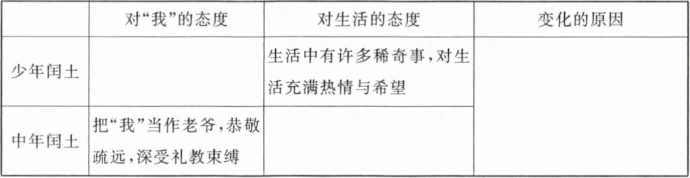 10. 闰土是小说中的主要人物,作者运用前后对比的方法,不仅从外貌、语言、动作上进行对比,更从对“我”的态度和对生活的态度上进行了对比,请依据提示完成下页的表格。