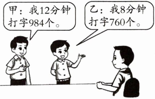 (2)①甲:984÷12=82(个) 乙:760÷8=95(个) 82个<95个 应选乙。 ②甲打字员20分钟可以打多少个字?