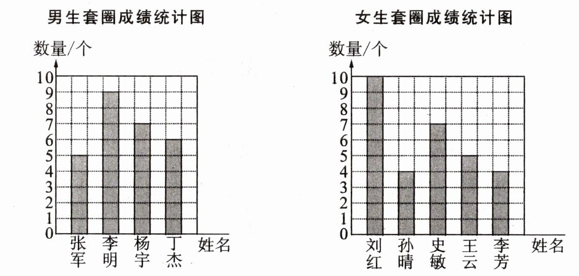 2. 四(2)班同学进行套圈比赛,每人套 10 个圈,下面的两幅条形统计图分别表示的是第 1 小组男、女生套中个数的情况。