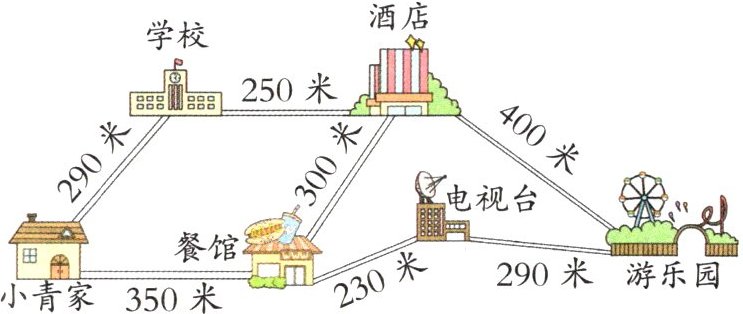 从小青家经过餐馆,再到电视台,最后到游乐园,这条路最近。
