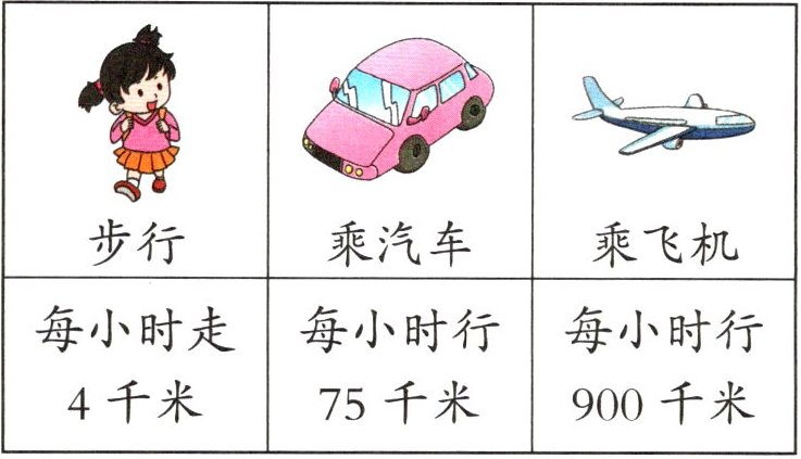 |每小时走4千米|每小时行75千米|每小时行900千米|