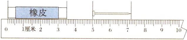 (1)如图,橡皮长( )毫米,钉子长( )厘米( )毫米,橡皮比钉子长( )毫米。