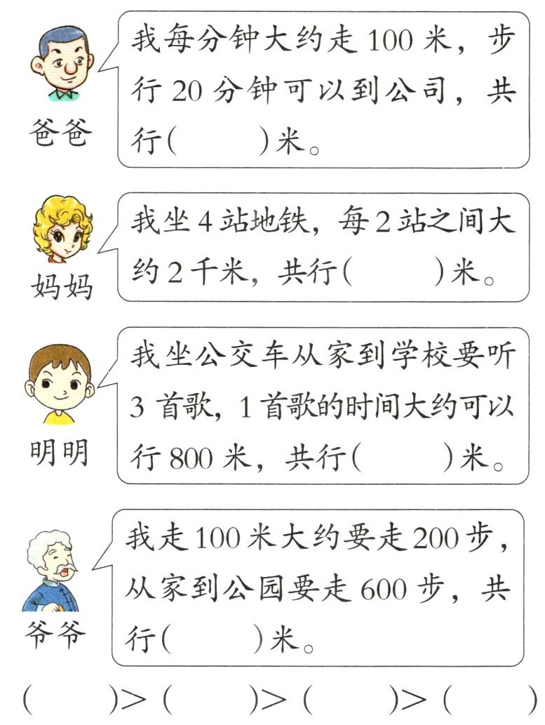 5. 估一估每个人到各自目的地的距离,再按距离由远到近排序。(填称呼)