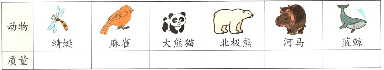 7. 你知道下面这些动物大约有多重吗?请将调查结果填在表格里。