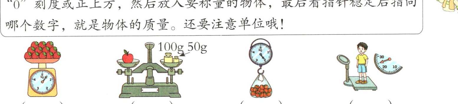 使用电子秤、盘秤等称重工具时,要先将秤水平放好,使指针指向“0”刻度或正上方,然后放入要称量的物体,最后看指针稳定后指向哪个数字,就是物体的质量。还要注意单位哦!