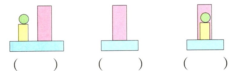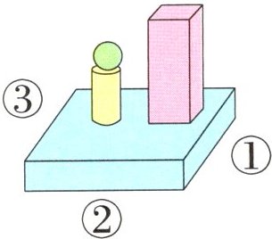 3. 明明利用学具搭出了一个立体图形。下面三个图分别是明明在不同位置看到的形状,请把序号填在相应的括号里。