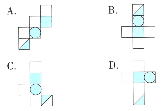 4. 如图,有一个正方体纸盒,在它的三个侧面分别画有三角形、正方形和圆。现用一把剪刀沿着它的棱剪开,成为一个平面图形,则展开图可以是( )。