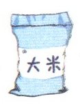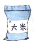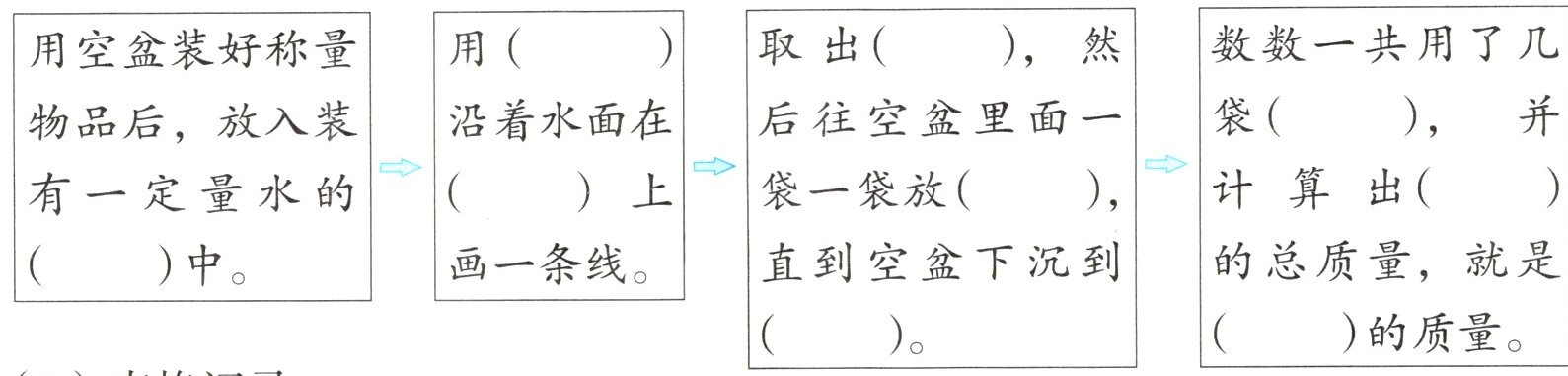 |用空盆装好称量物品后,放入装有一定量水的( )中。|→|用( )沿着水面在( )上画一条线。|→|取出( ),然后往空盆里面一袋一袋放( ),直到空盆下沉到( )。|→|数数一共用了几袋( ),并计算出( )的总质量,就是( )的质量。|
