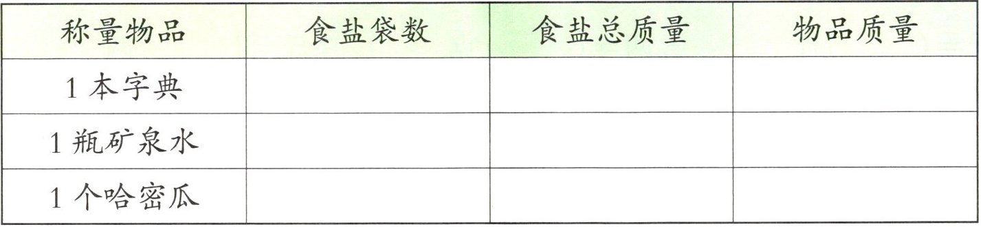 (1) 准备材料,需要的材料有:干净的自来水,( ),称量物品(字典、矿泉水、哈密瓜),200 克一袋的食盐若干袋,装称量物品的空盆。(选出缺少的材料,将编号填在括号里)