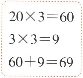 $\begin{cases}20×3 = 60 \\ 3×3 = 9 \\ 60 + 9 = 69\end{cases} $