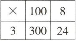 C. $\begin{array}{|c|c|c|}\hline ×&100&8\\ \hline 3&300&24\\ \hline \end{array}\\ \hline $ $300+24= 324$