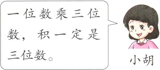 $\boxed{\begin{array}{l}\mathrm{一}\mathrm{位}\mathrm{数}\mathrm{乘}\mathrm{三}\mathrm{位}\mathrm{数}\mathrm{,}\mathrm{积}\mathrm{一}\mathrm{定}\mathrm{是}\mathrm{三}\mathrm{位}\mathrm{数}\mathrm{。}\\ \mathrm{小}\mathrm{胡}\end{array} }$