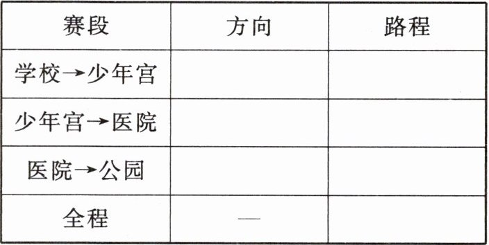 (1)根据下面的路线图,说一说每一赛段的方向和路程,并完成下表。
