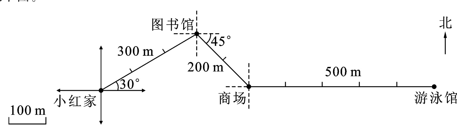 今天是星期日,我上午在家里画画。下午一点钟,我从家出发,沿东偏北30°方向走300 m到图书馆看书。下午三点钟,我从图书馆出来,沿东偏南45°方向走200 m到商场购买学习用品。然后沿正东方向走500 m到游泳馆练习游泳,一直等到妈妈下班后来接我一起回家。我今天过得很愉快!