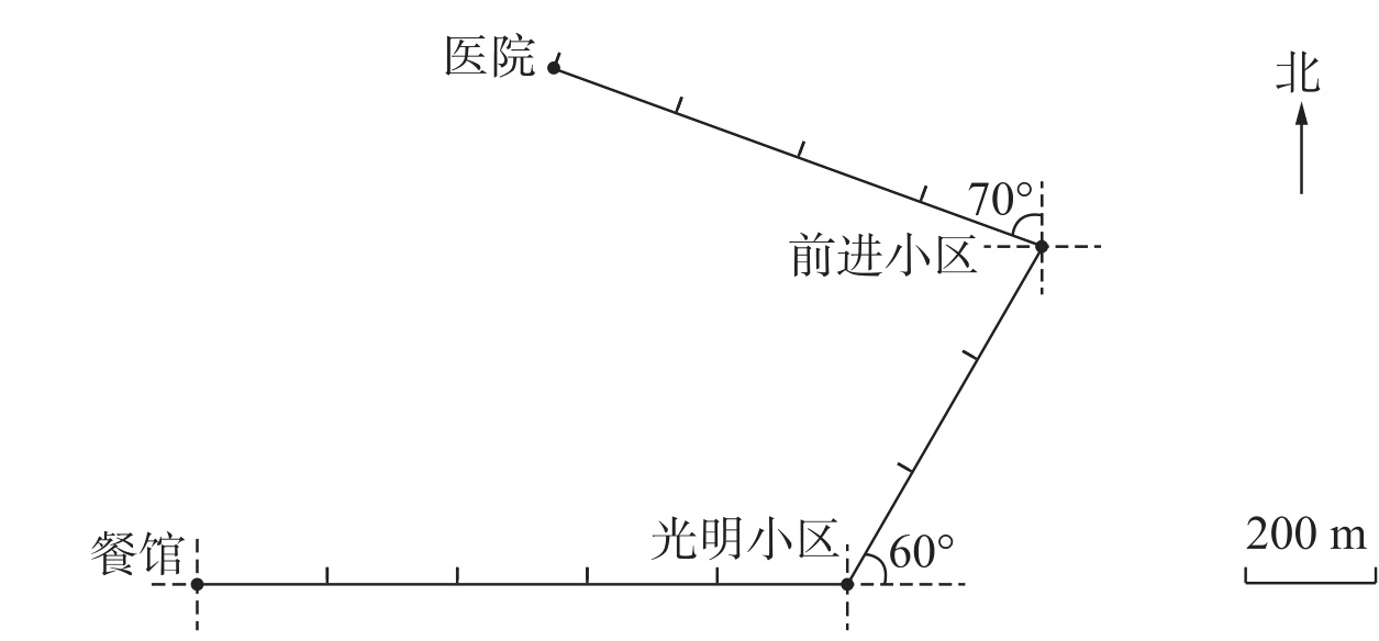 (2)外卖员从餐馆取餐后,向正东方向行驶1000 m,到达光明小区送第一份餐;再从光明小区向东偏北$60^{\circ}$方向行驶600 m,到达前进小区送第二份餐;最后从前进小区向北偏西$70^{\circ}$方向行驶800 m,到达医院送第三份餐。