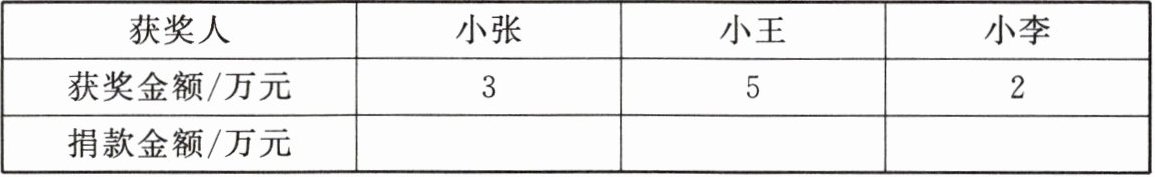 (4)某高校三名大学生的科技发明获得了10万元奖金,他们决定拿出3万元捐献给学校购买书籍。根据每人获奖金额的多少,三人分别应捐款多少钱?请写出计算过程并填表。