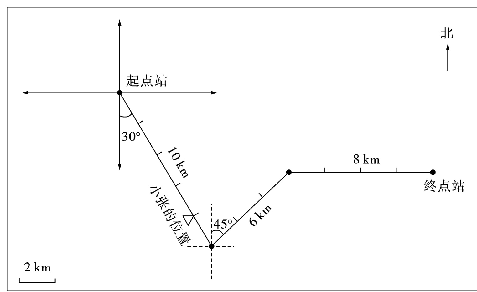 (6)一辆汽车从起点站沿南偏东$30^{\circ}$方向行驶10 km后,又沿北偏东$45^{\circ}$方向行驶6 km,最后沿正东方向行驶8 km到达终点站。