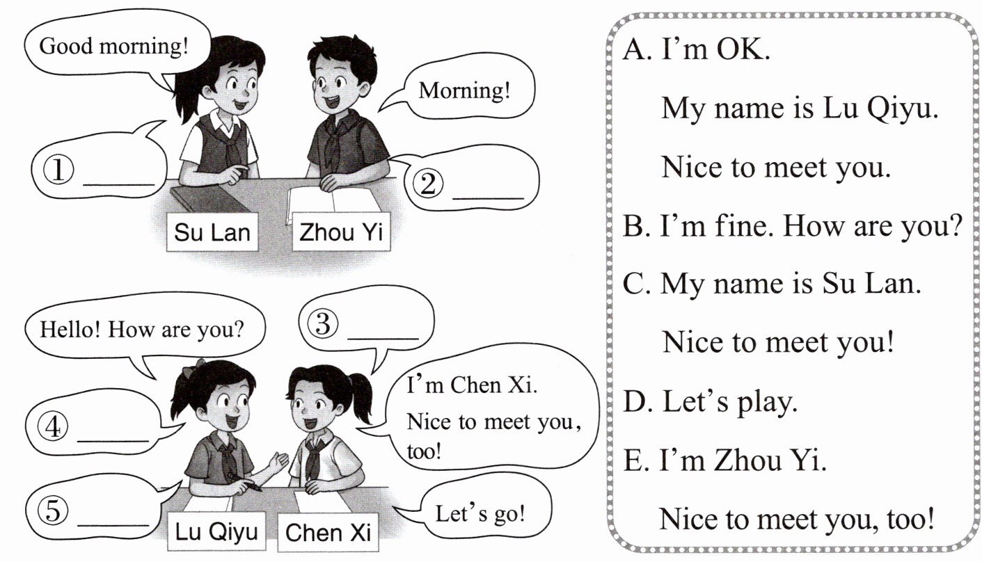 认识新同桌。把合适句子的字母序号写在对应的横线上,完成对话。