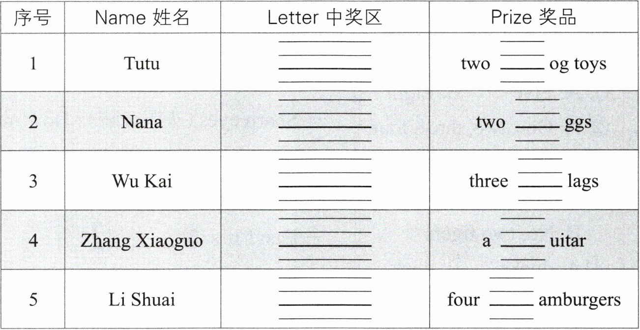 同学们正在参加游乐场“幸运大转盘”的抽奖活动。听录音,将听到的字母的大小写,分别写在对应的四线格里,完成奖品记录单。