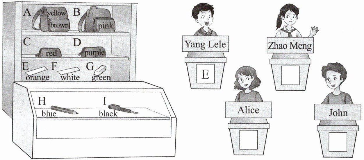 Yang Lele 想了解同学们从文具店里购买的学习用品及其颜色。听录音,找到对应的图片,照样子,将其字母序号写在方框里。